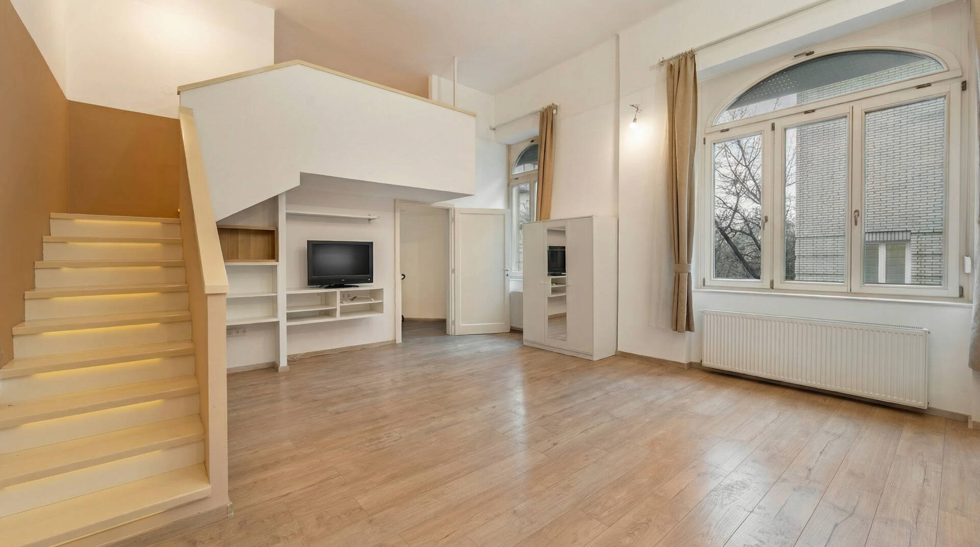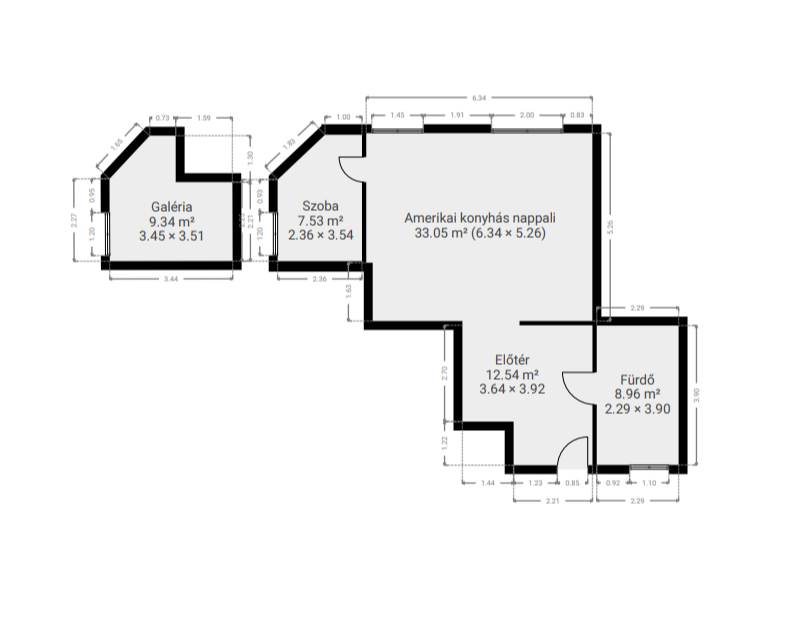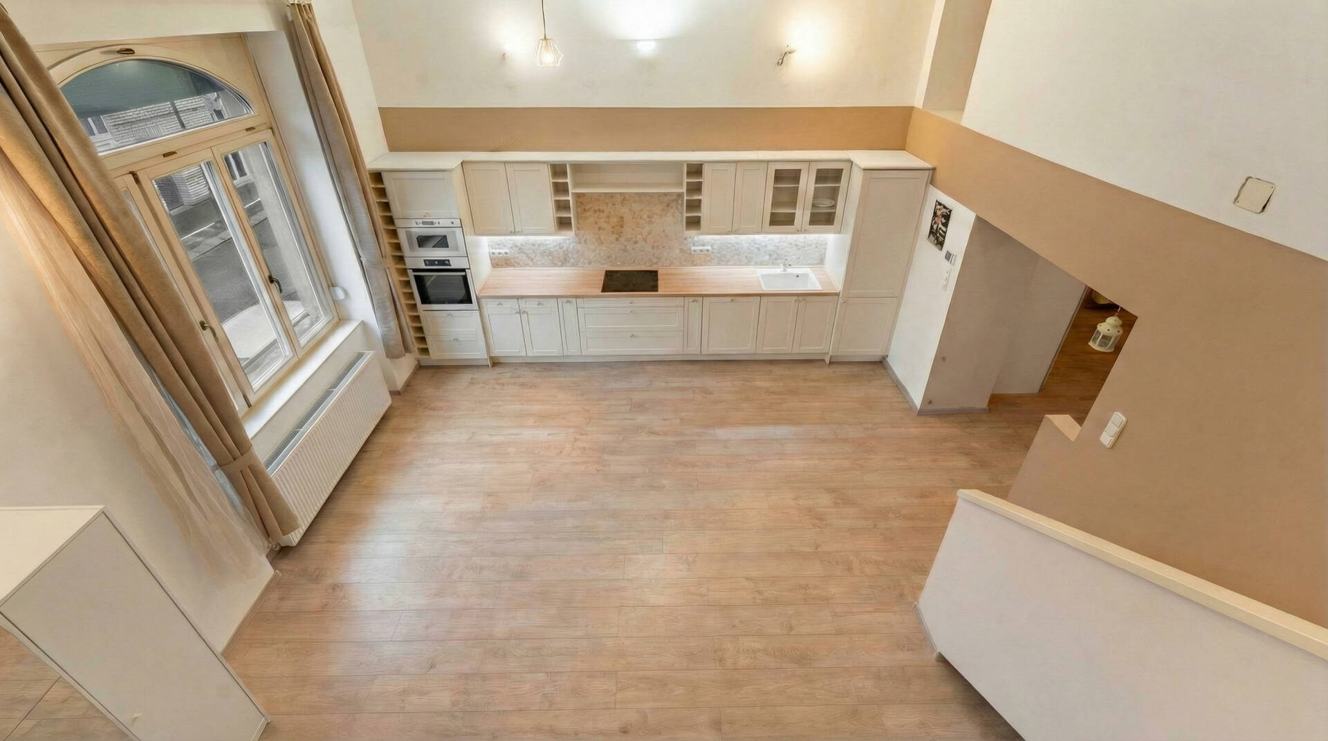 Különlegességét a kétszintes elrendezés adja, ahol az egyik hálószoba a galérián, az emeleti szinten kapott helyet.