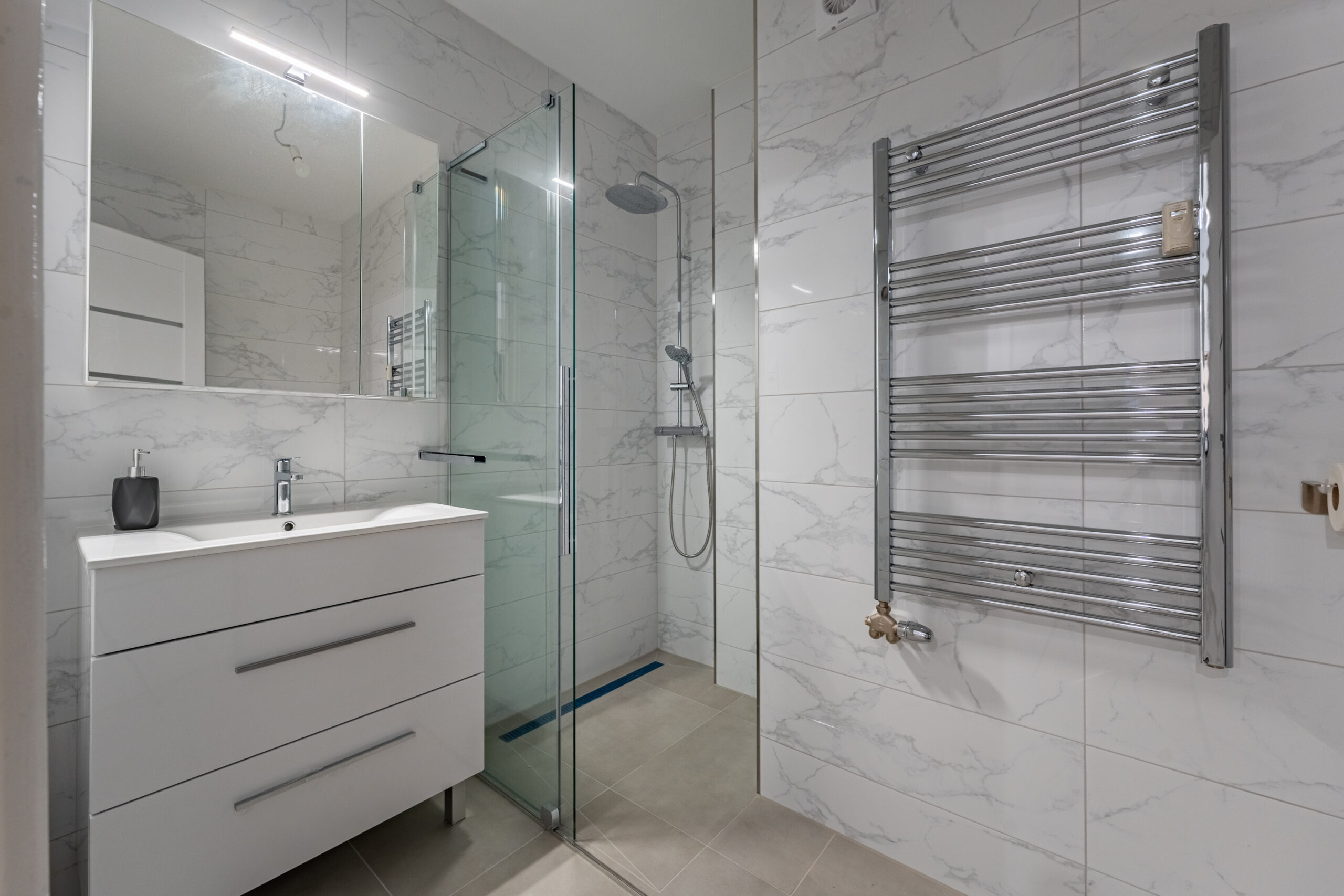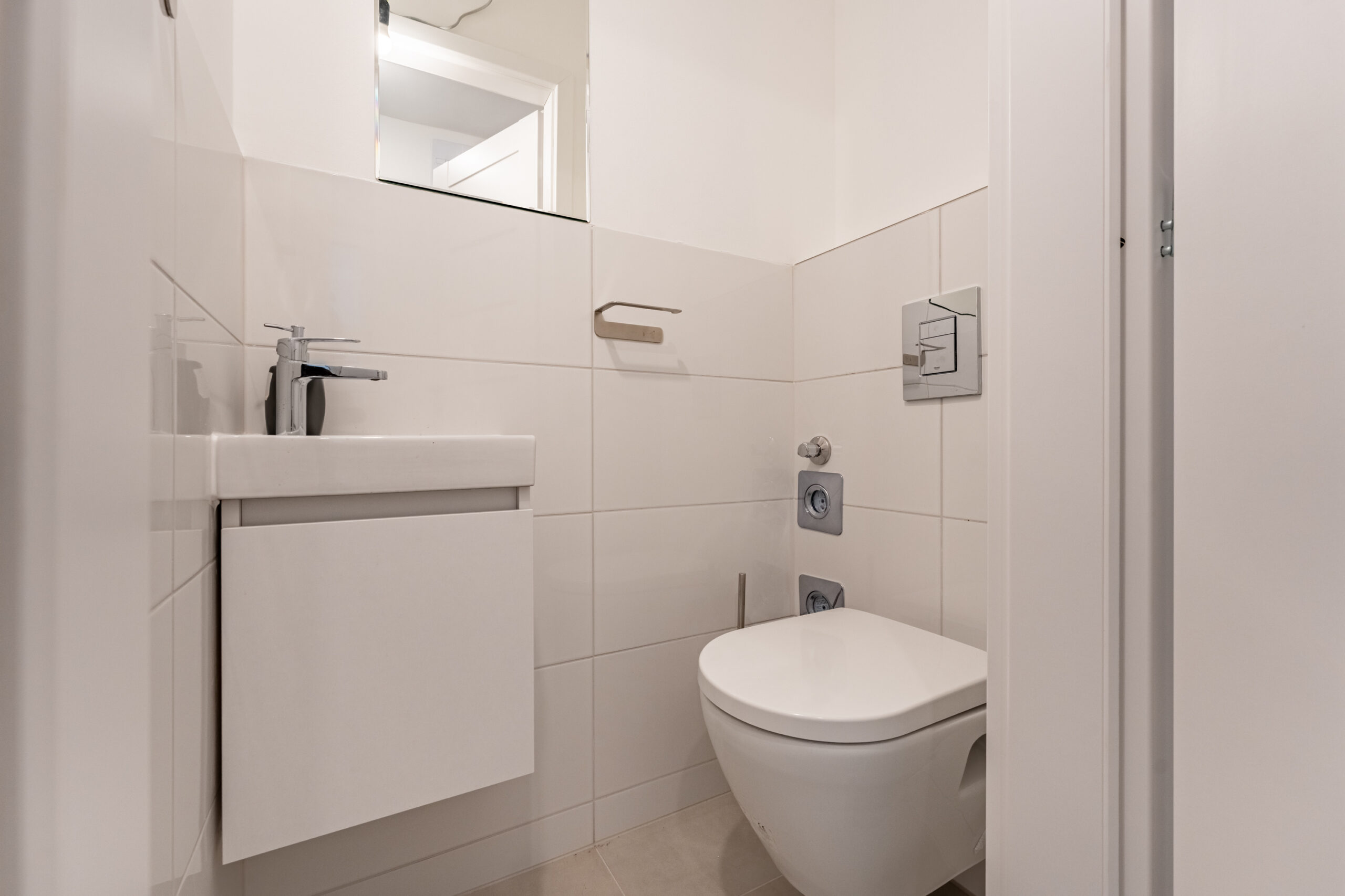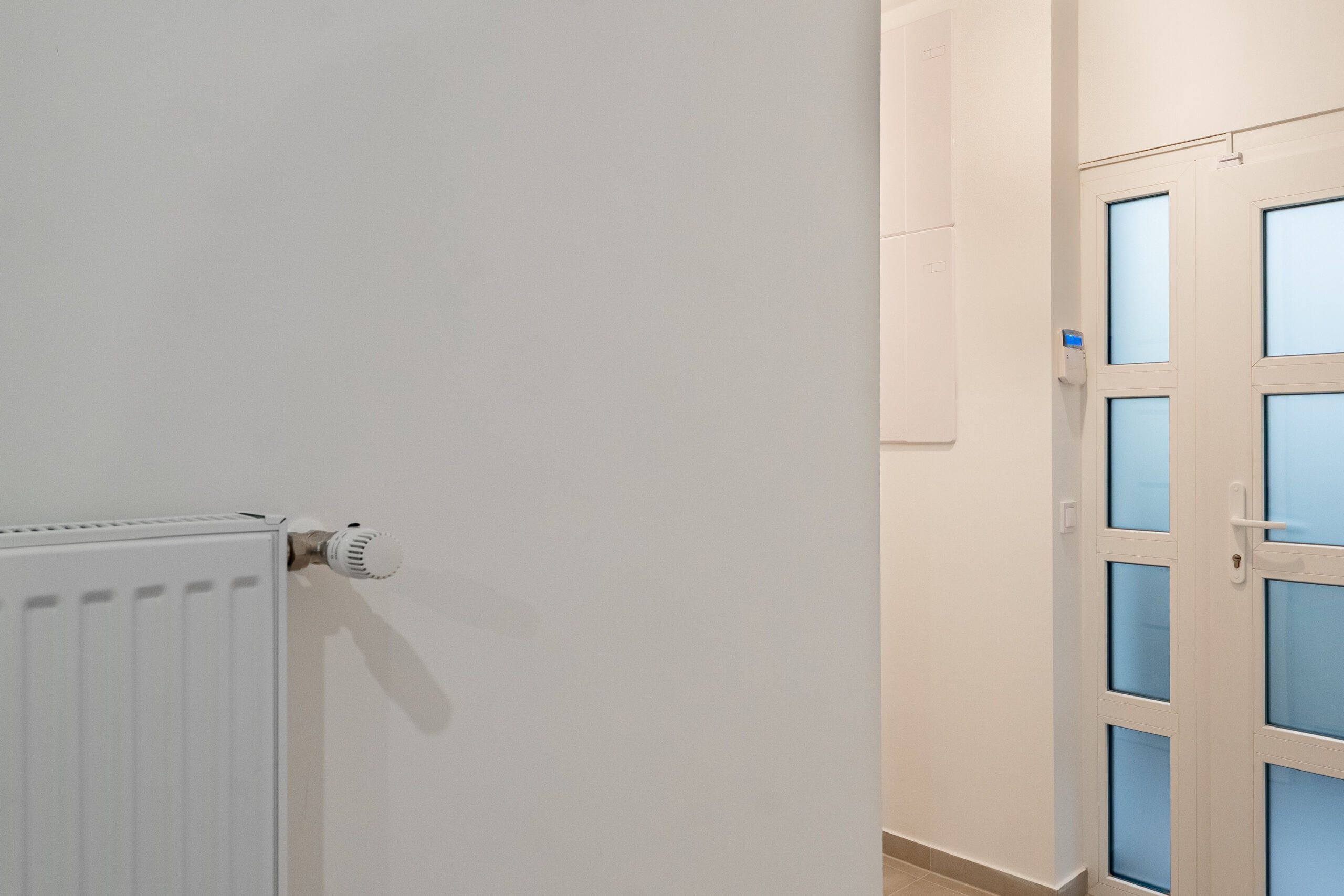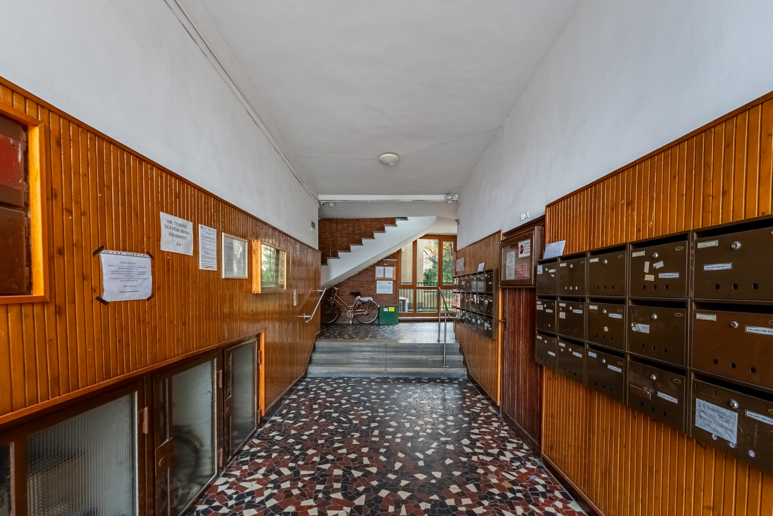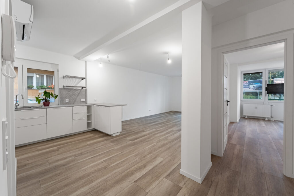 Az ingatlanba belépve a tágas előszobába érkezünk, melyből a vendég toalett is megtalálható, továbbhaladva jobbra a fürdőszobát láthatjuk, balra fordulva pedig a teljesen gépesített konyha ékeskedik.