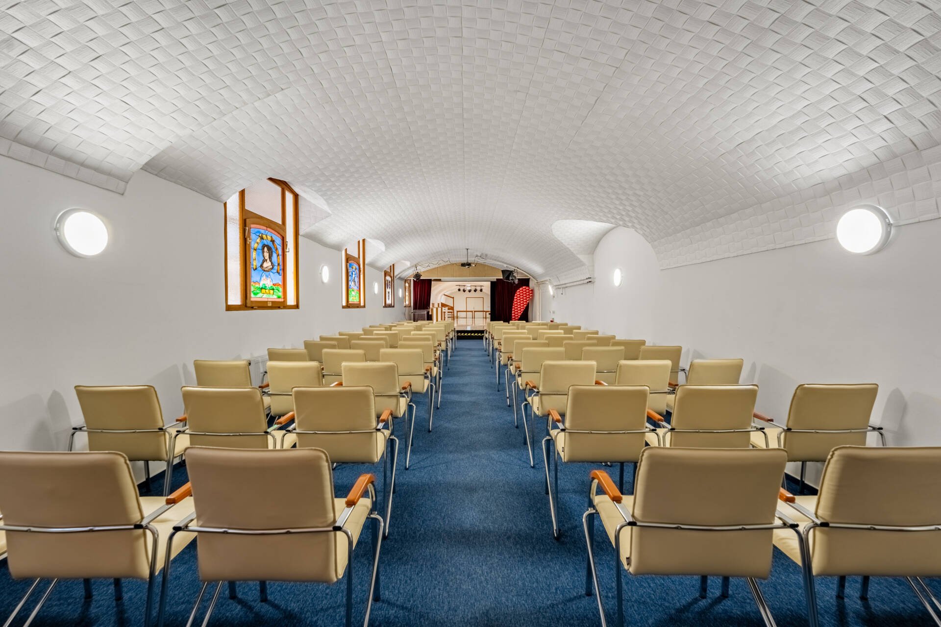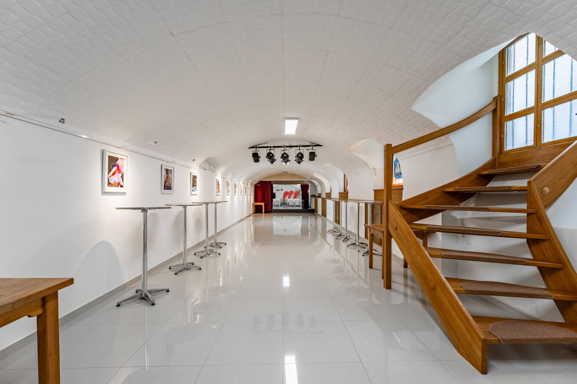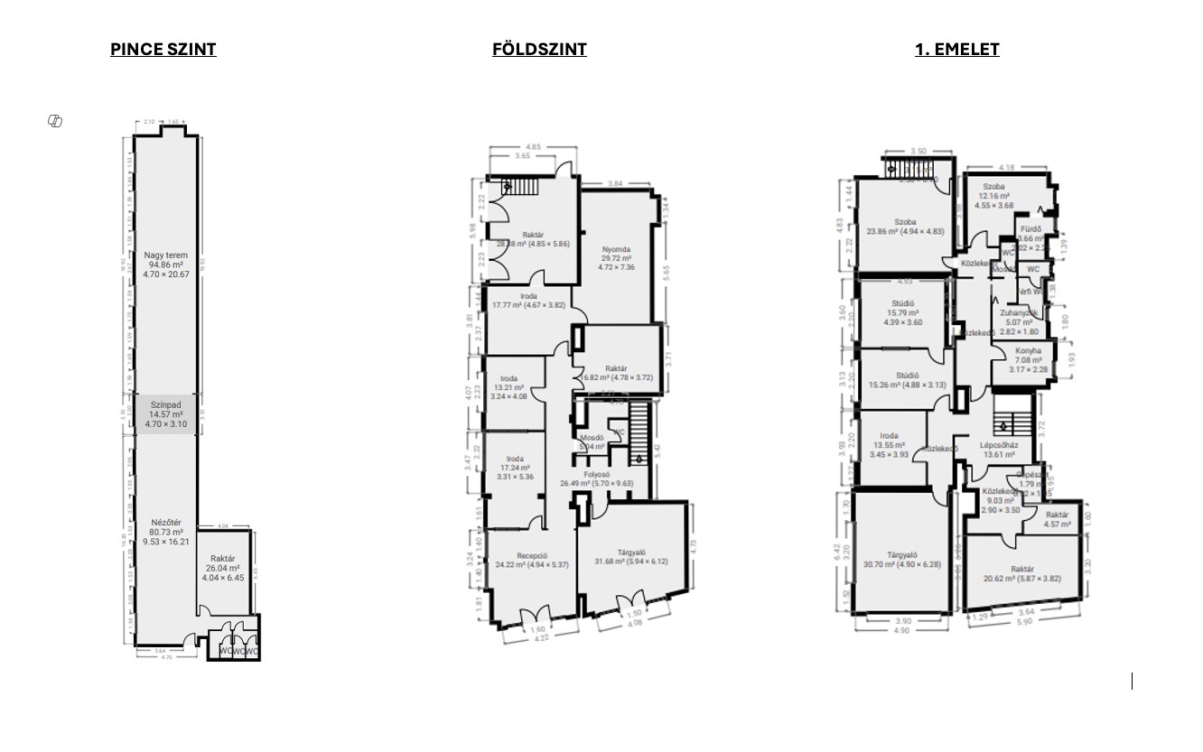 Pinceszint (rendezvényterem): közel 95 m²-es tágas nagyterem színpaddal és nézőtérrel, külön raktárhelyiségekkel, mosdókkal.