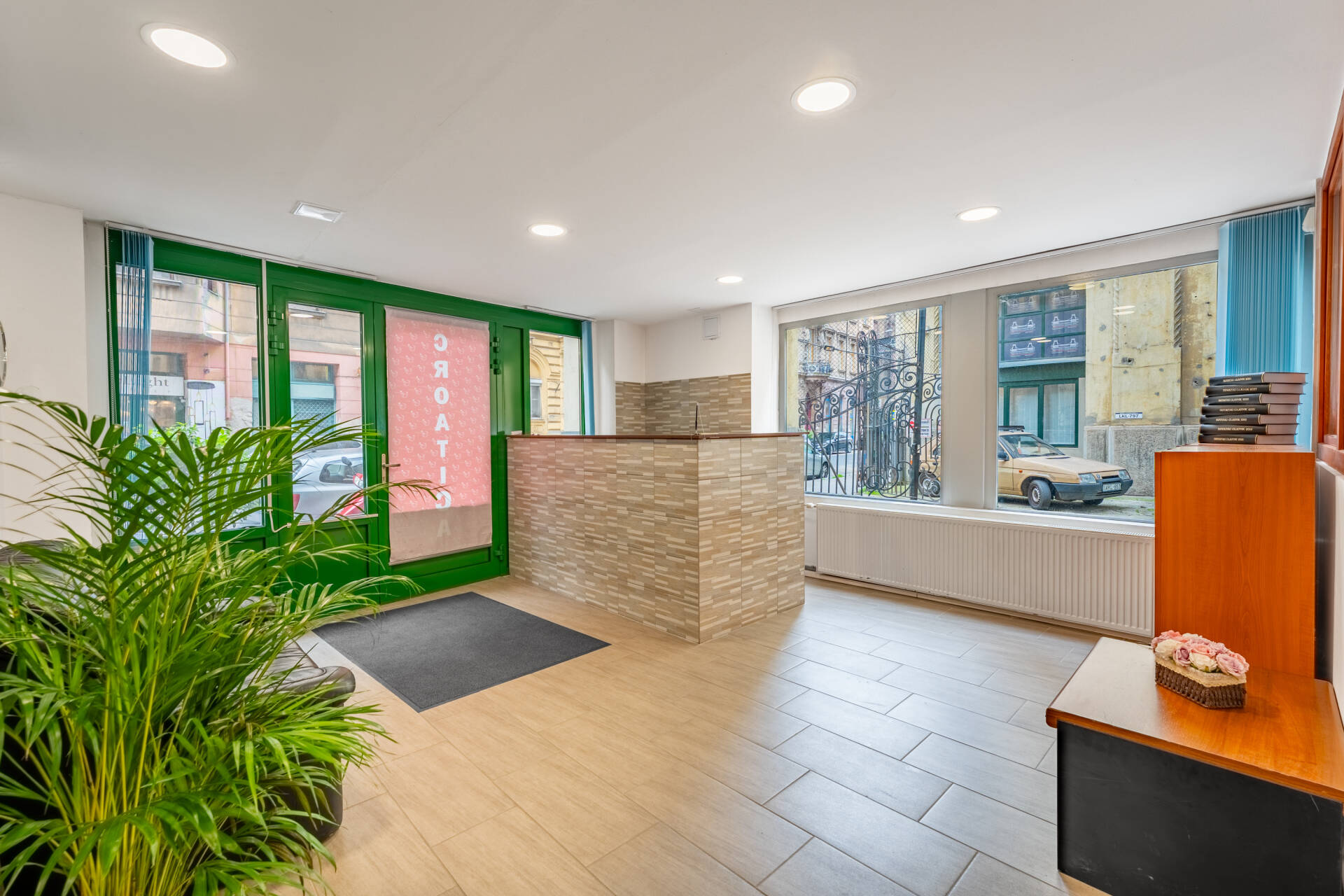 Az épülethez tartozik egy hátsó bejárat, amely előtt két gépkocsibeálló hely található, ezek a vételár részét képezik, így a belvárosi parkolás is megoldott.