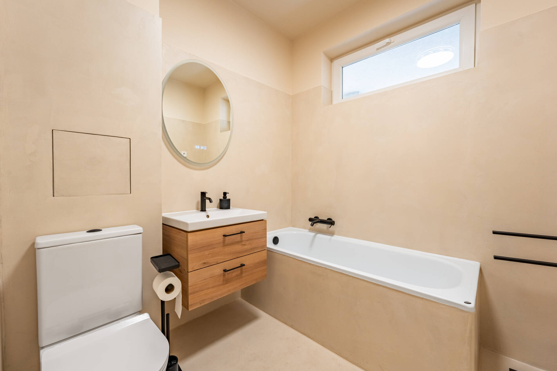 A lakás dupla komfortos, az alsó szinten kádas fürdőszoba, a felső szinten zuhanyzós fürdőszoba szolgálja a mindennapi kényelmet.