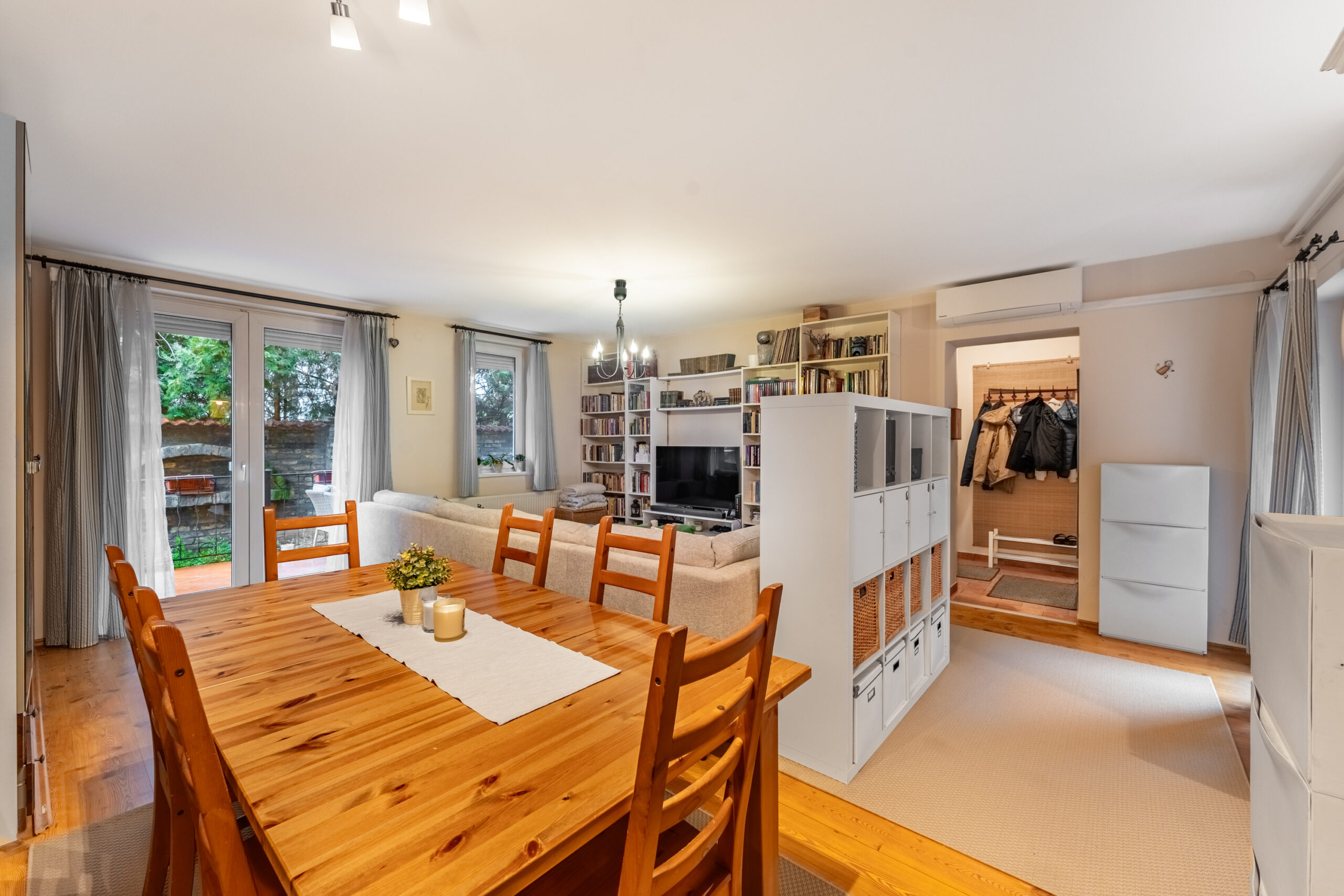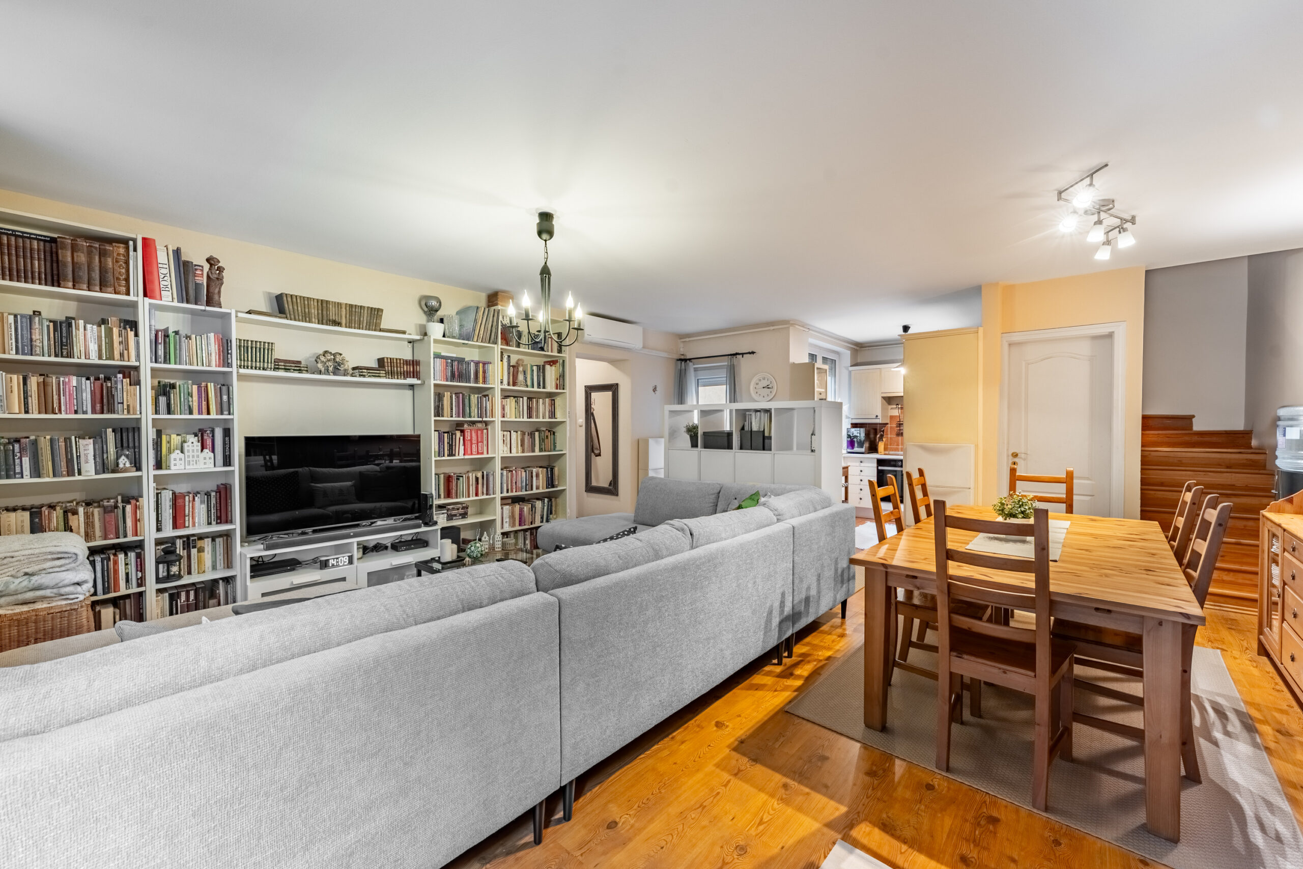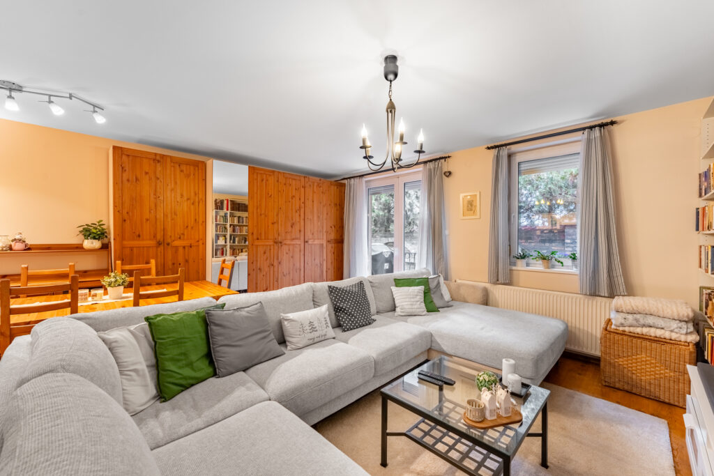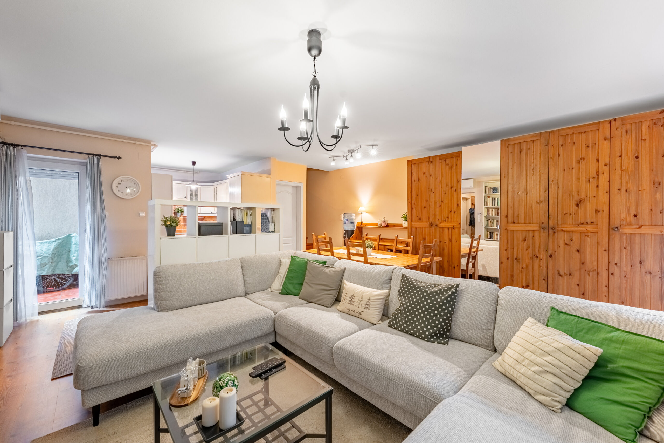 Ingatlanunk szerintem a családi otthon kifejezést maximálisan alátámasztja, hiszen egy rendkívül tágas nappaliba érkezünk az előszobából, mely egy teret alkot a konyhával, így akár főzés közben is szemmel lehet tartani a gyerekeket miközben mesét néznek.