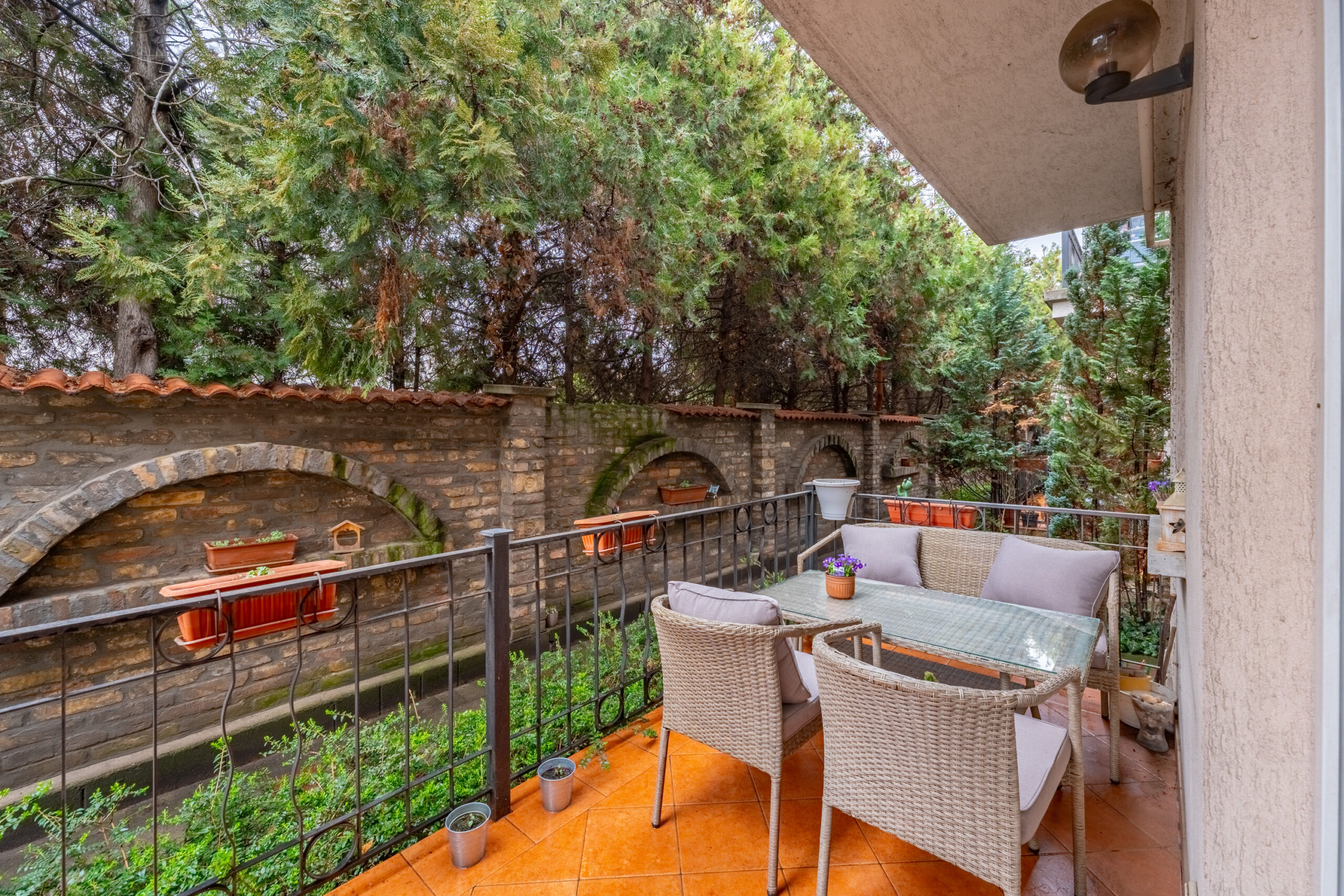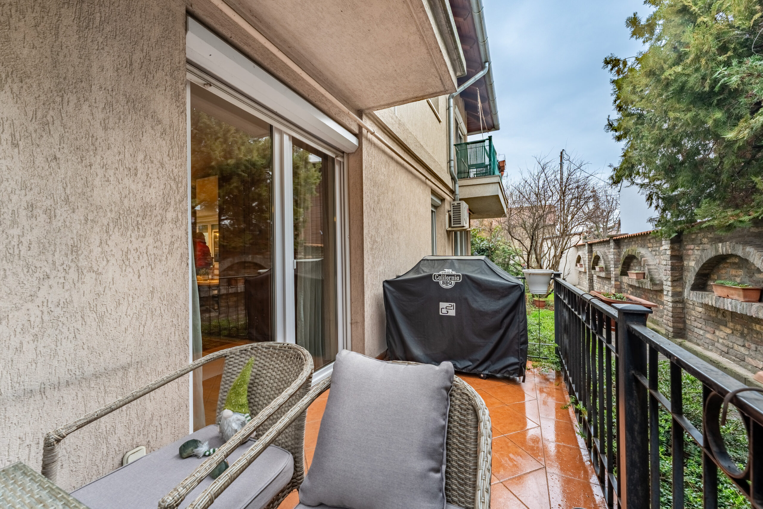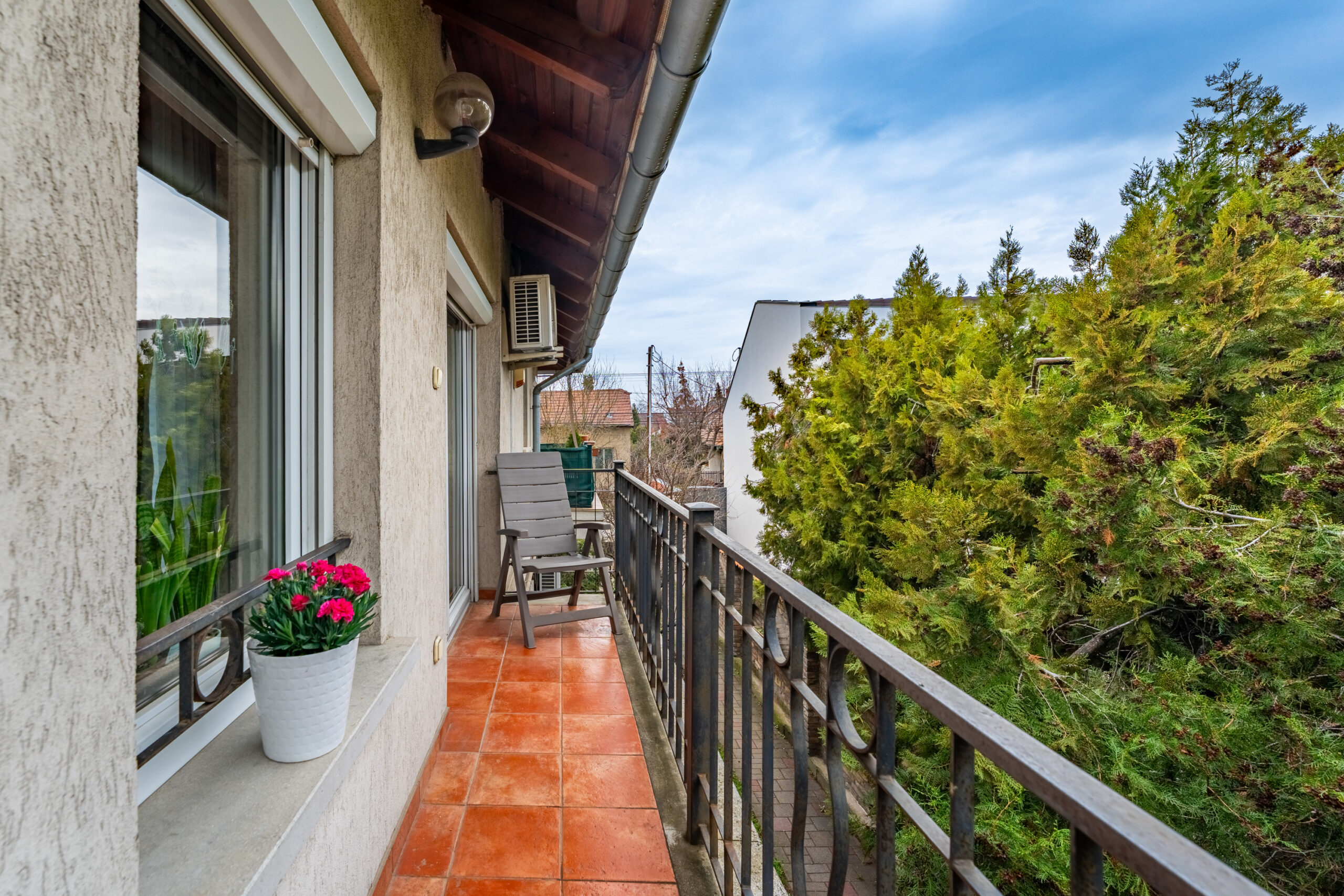 2 terasz is nyílik erről a szintről, a privátabb, mely a konyhával szomszédos, a kíváncsi szemek elől elzárt, a tágasabb pedig a nappaliból nyílik, mely a maga 8 négyzetméterével akár egy sütögetéshez, borozgatáshoz is remekül szolgálhat.