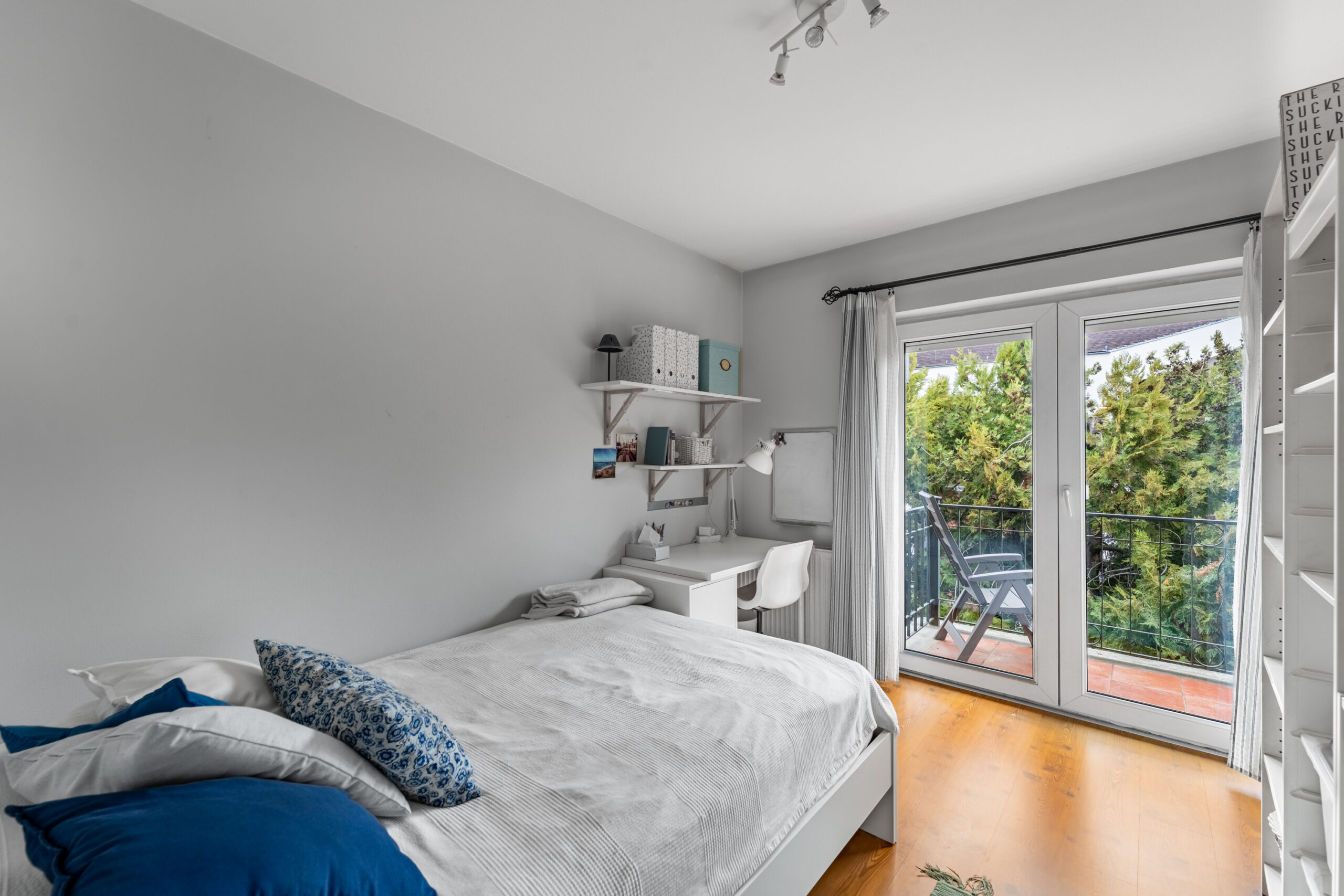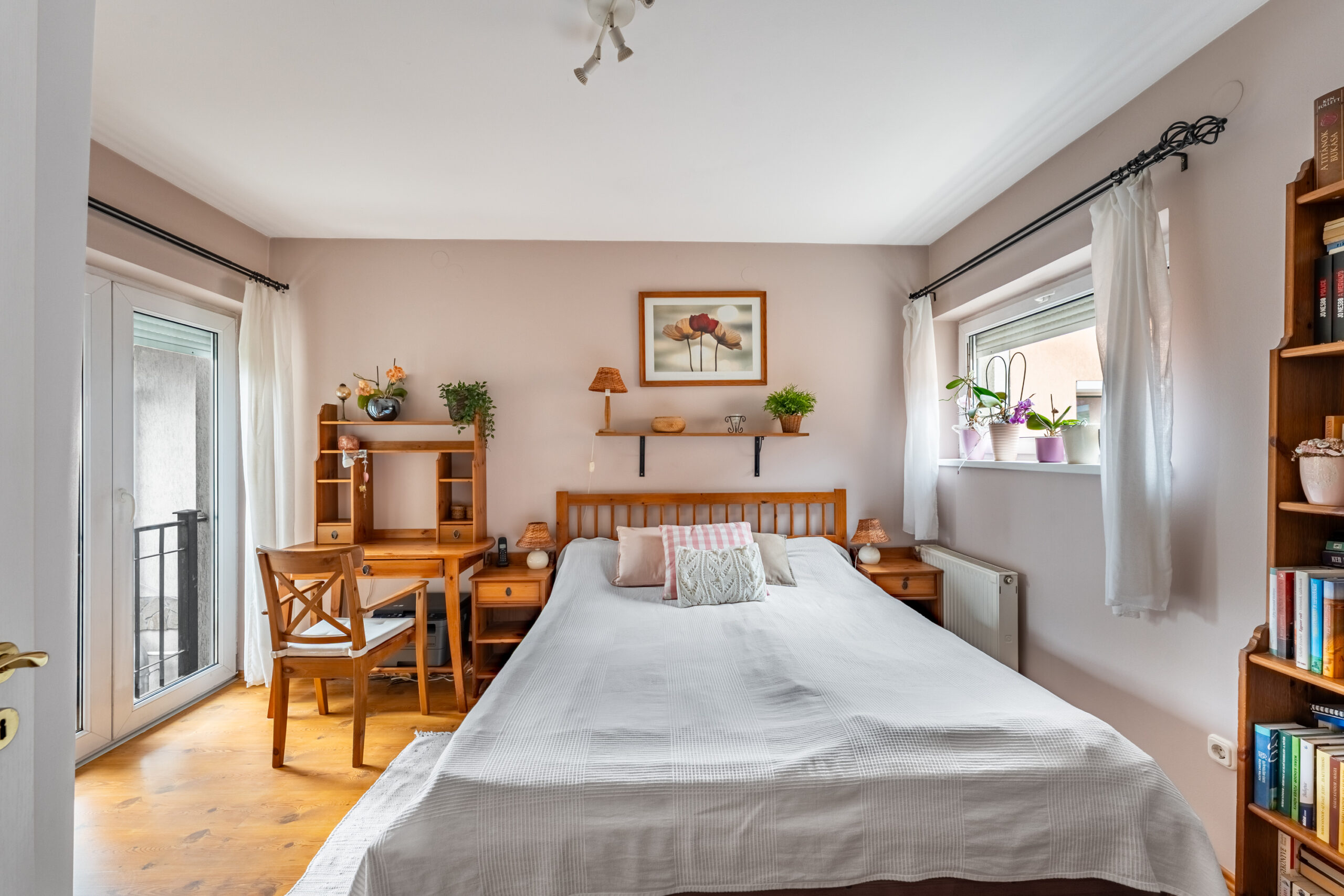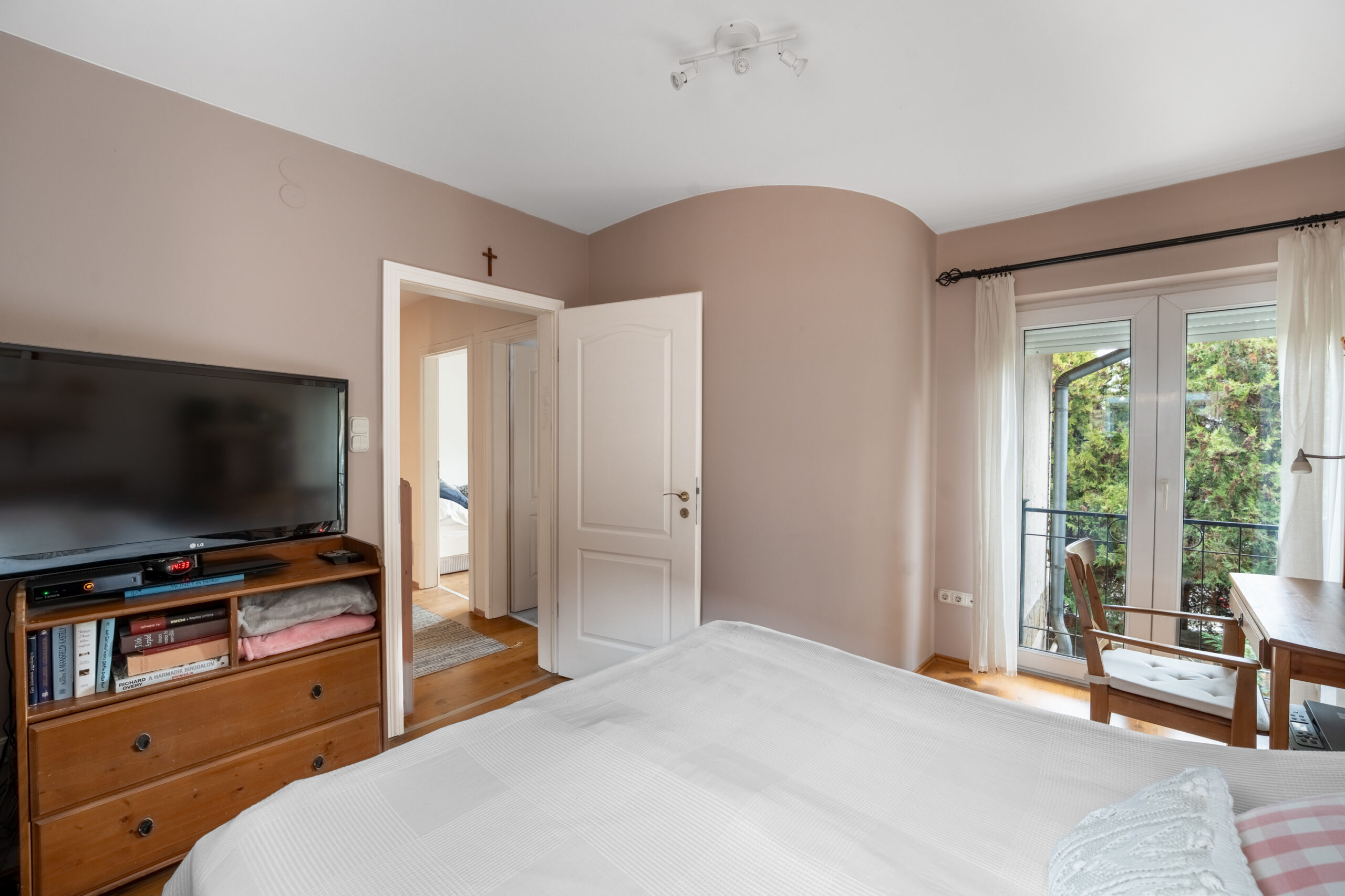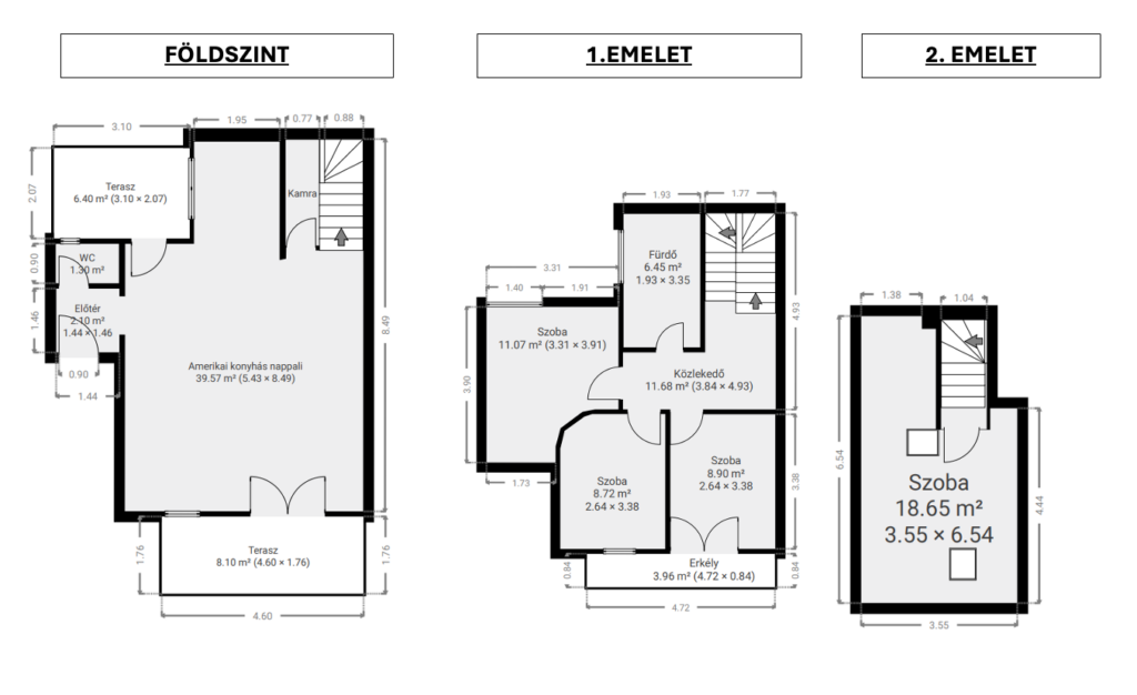 Felérve az 1. emeletre a közlekedőből nyílik 2 erkélyes hálószoba és egy szülői hálószoba, ami szomszédos a kádas, ablakos fürdőszobával.