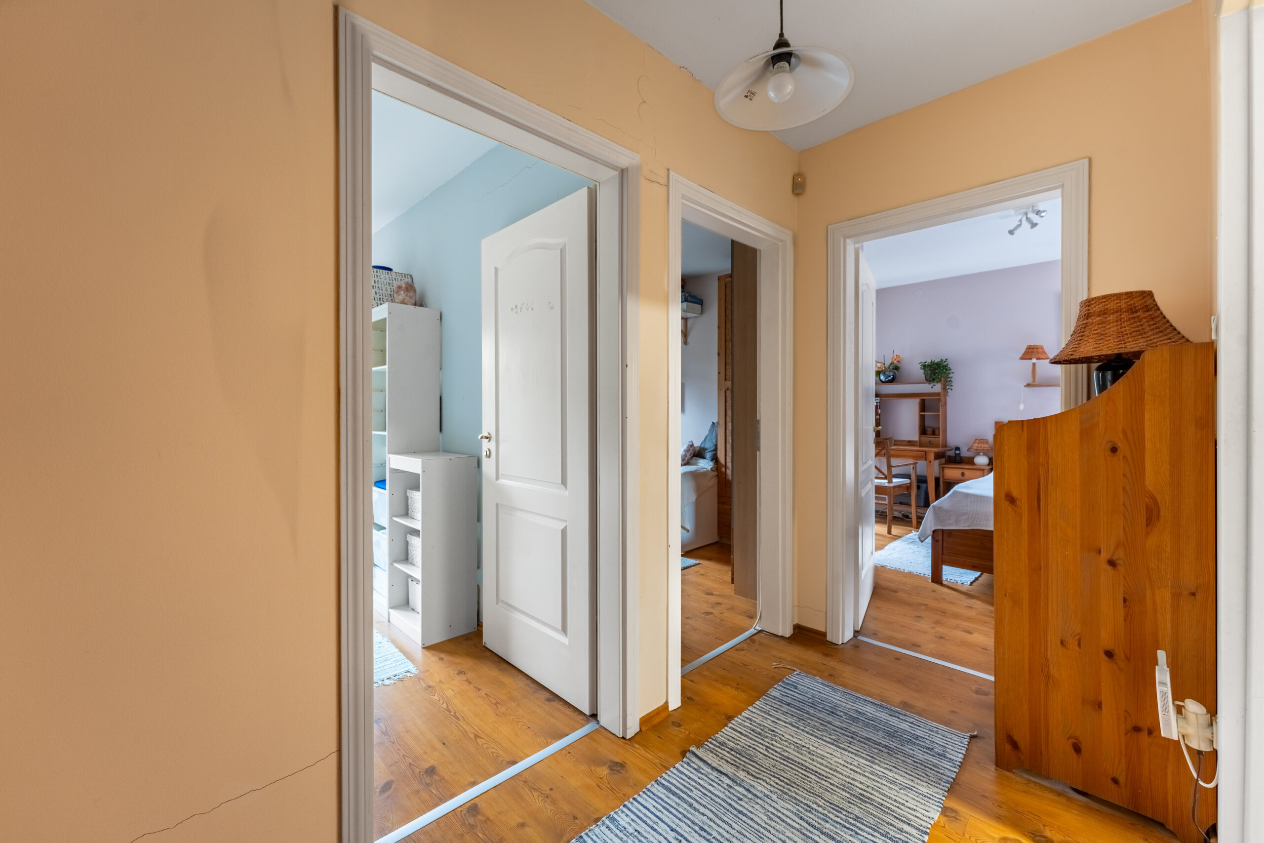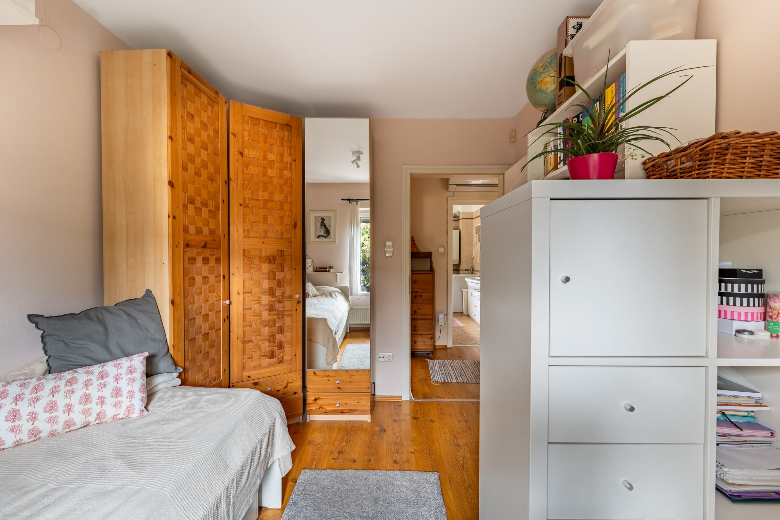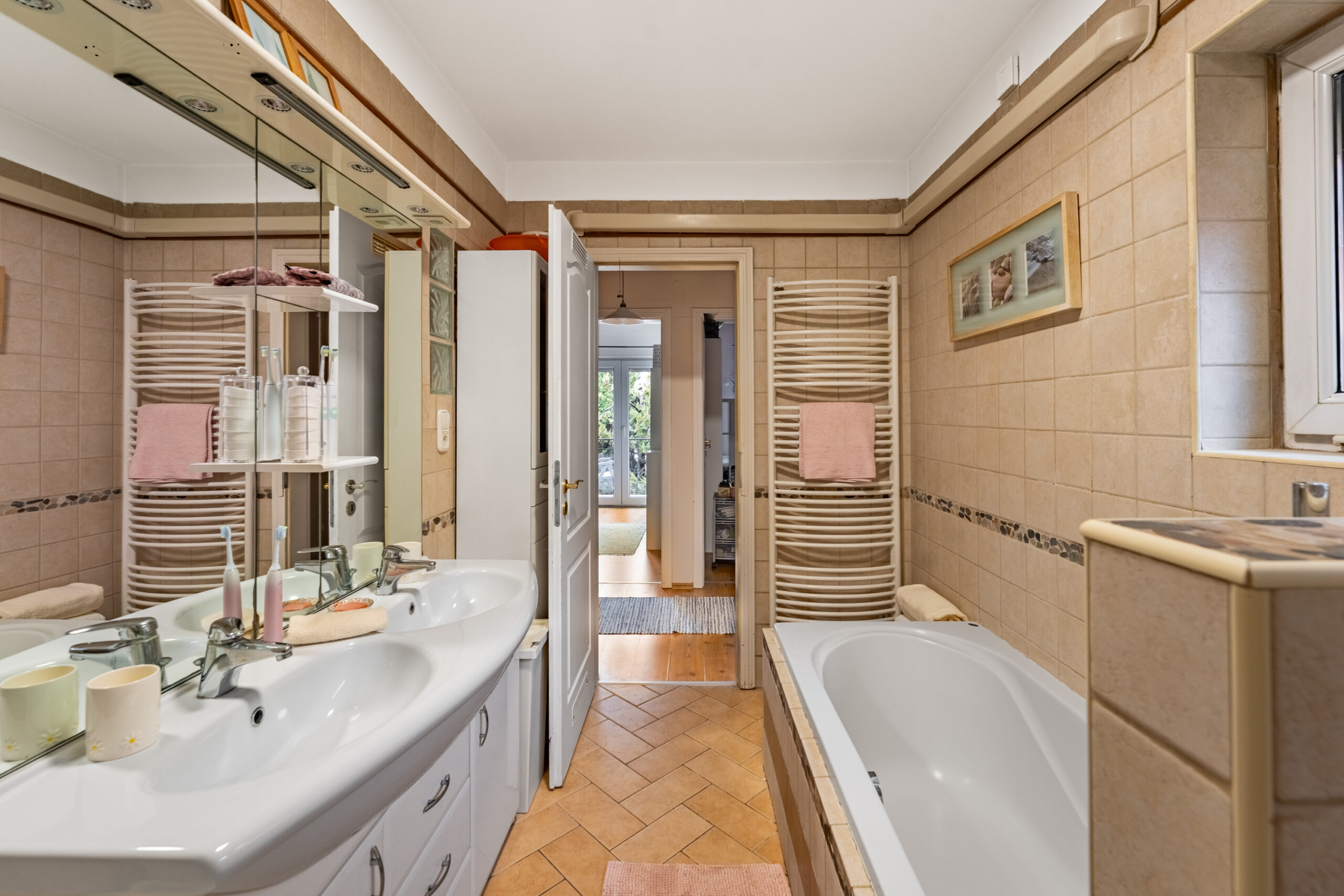Felérve az 1. emeletre a közlekedőből nyílik 2 erkélyes hálószoba és egy szülői hálószoba, ami szomszédos a kádas, ablakos fürdőszobával.
